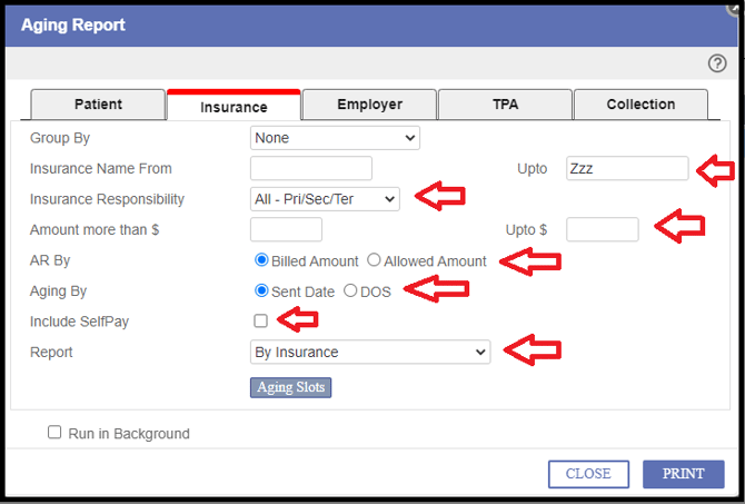 Step 9: Select AR By: Billed Amount / Allowed Amount (Select one of the options)>>